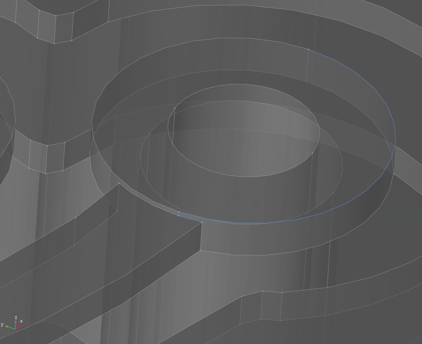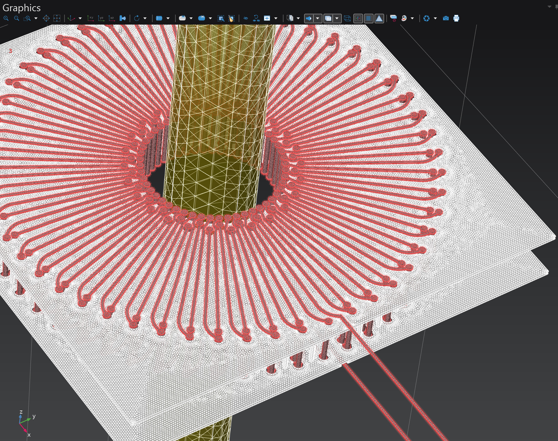 The differences were minor enough that one wouldn’t notice them just by spinning the model in the COMSOL model builder view or a CAD. However, soon it was discovered that while the first model could be successfully simulated in COMSOL using pretty much default settings aside from a slight mesh refinement (taking about 4 days and ~190 GiB of RAM with the GMRES solver), the second one was consistently failing to converge. The first sign of trouble was that the mesh builder was reporting warnings related to small mesh elements. My first solution was to tweak the minimum element size setting to try and better resolve finer regions of the model, but soon I discovered that the issue is that the second model contained poorly resolved artifacts that weren’t present in the original one. Consider this screenshot taken in SolidWorks, notice the small region near the center: