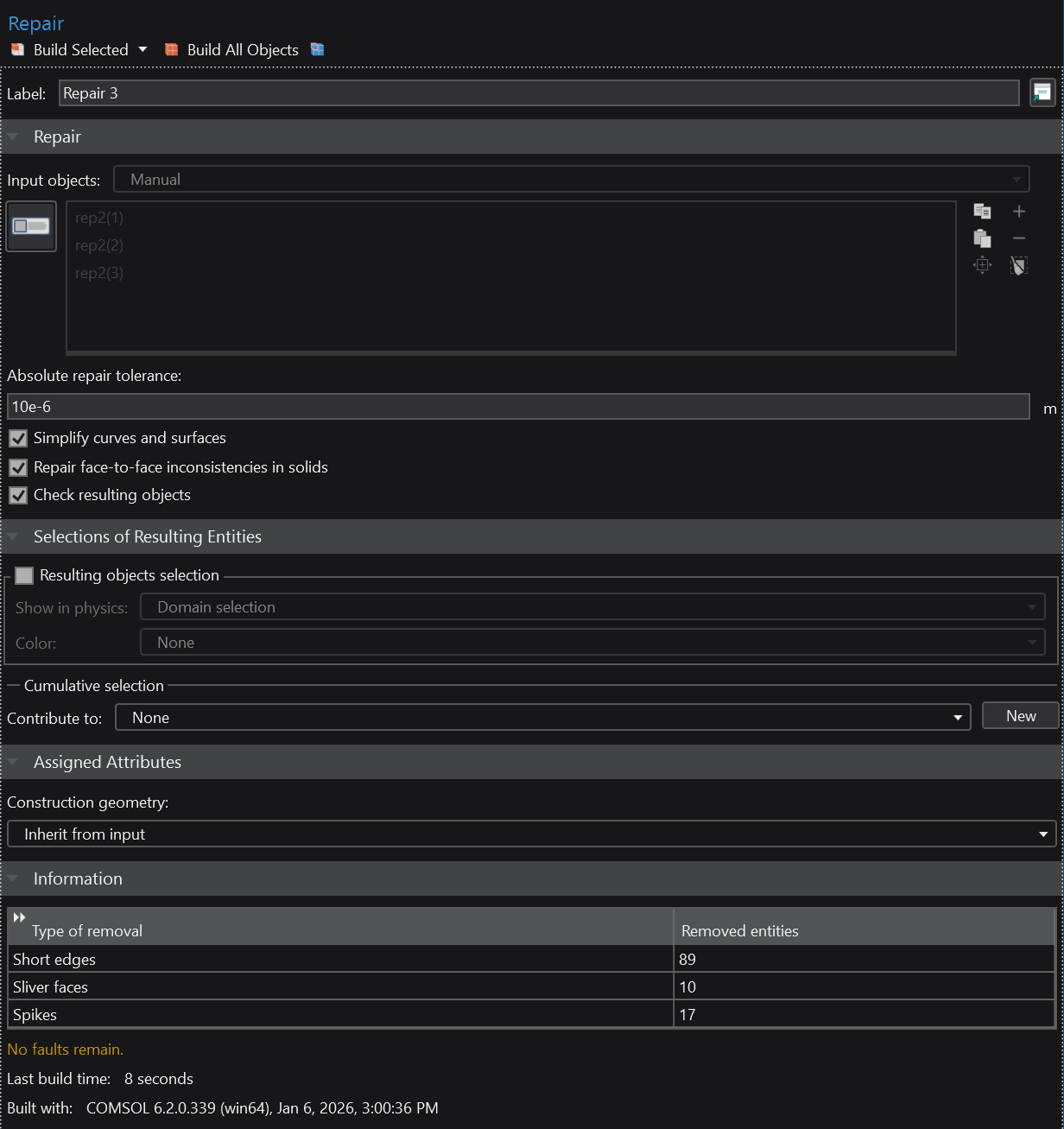 Merely slapping a Delete Spikes / Delete Sliver Faces / etc does not work for an unclear reason – all we get is a generic error message saying that a selected feature could not be removed. Sigh. Nor does a Repair node help by itself; however — per the recommendations given by COMSOL — a sequence of Repair nodes with progressively coarser tolerances appears to do the trick. Having a sequence of three repairs like this, going from 1 micron to 5 to 10 microns, appears to produce a mostly well-formed model: