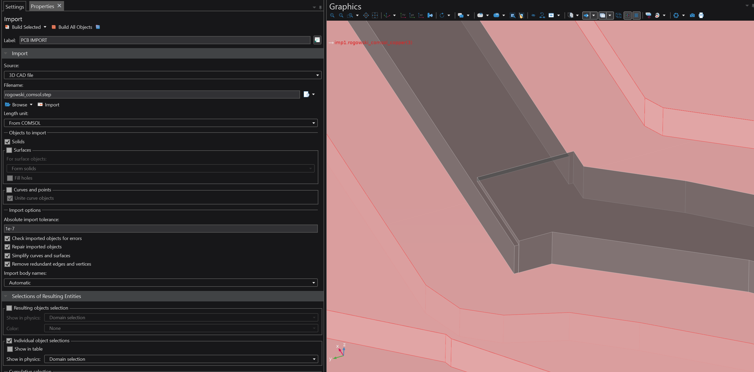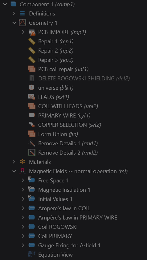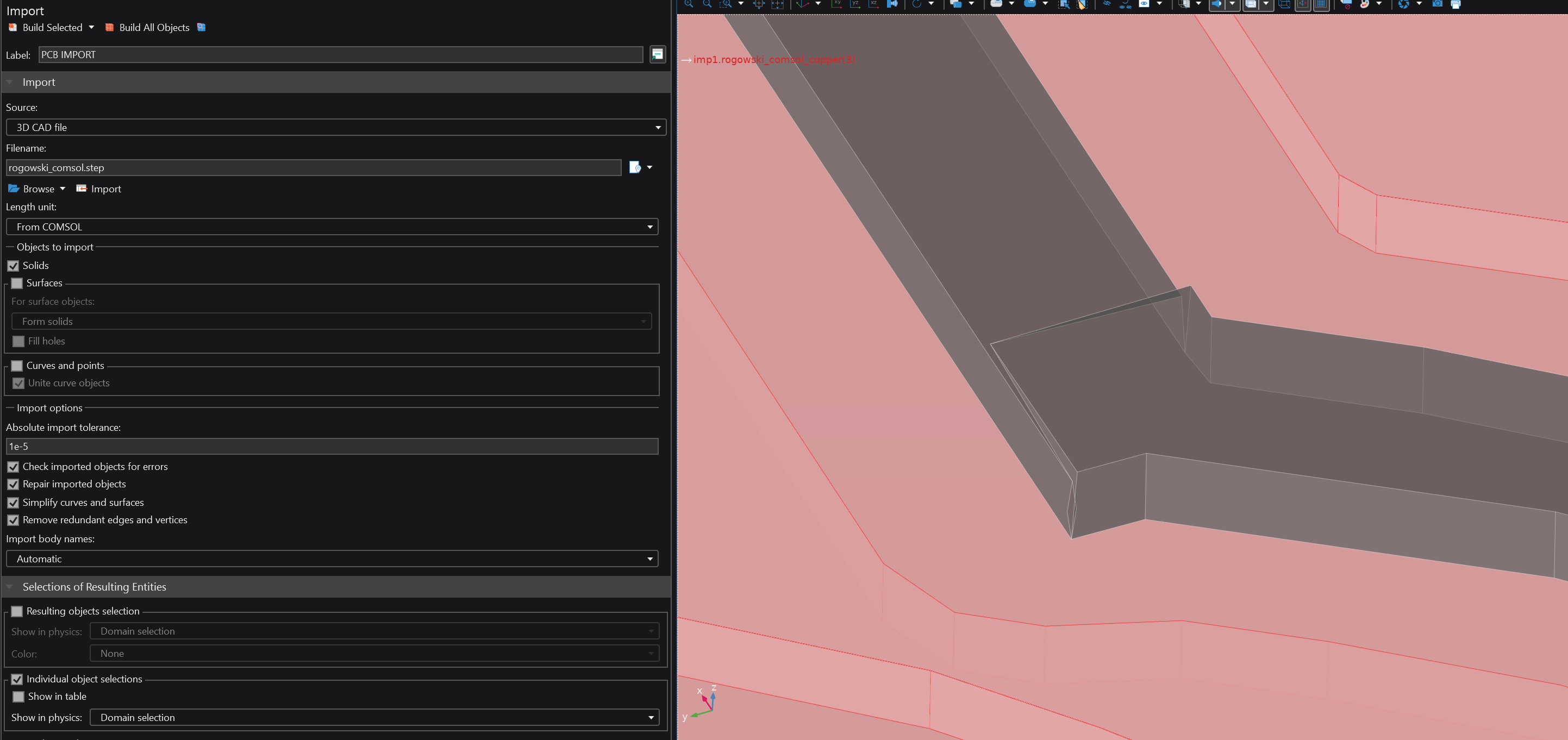 Once upon a time, there was a STEP model of a PCB planar transformer exported from KiCAD and imported into COMSOL for its evaluation as part of a 3D AC magnetic fields problem. The coil came in two revisions, the first revision having a simpler geometry compared to the second one. Due to some unknowable peculiarities of the KiCAD v9 STEP export feature, the two models were exported slightly differently despite using the exact same output settings: