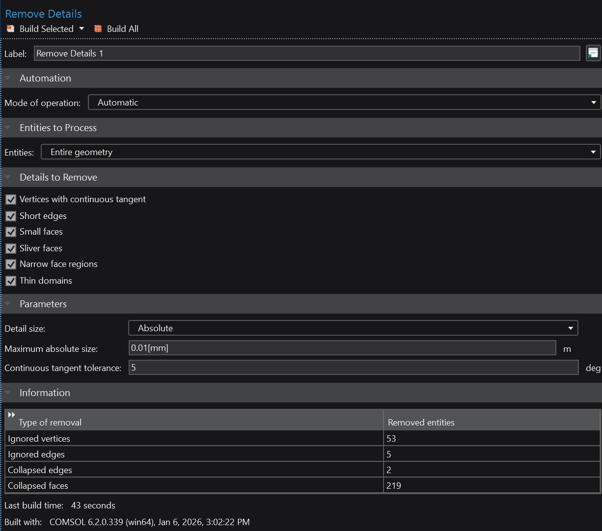 To polish off the remaining imperfections, we slap a couple of Remove Details on top with the absolute tolerance set to 10 and 15 microns, as shown below. It is critical that the tolerance is set manually because automatic selection will collapse valid model features and subsequently fail with an internal COMSOL assertion failure.